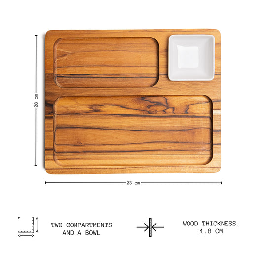 NEW ARRIVAL Bandeja para Servir en Madera de Teca Natural PALERMO, rectangular y resistente, con 2 compartimientos y cuenco para salsas, ideal para carnes, pollo, embutidos y tapas (24.5×21.5×2.4 cm)
