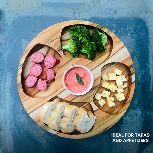 Bandeja para Servir en Madera de Teca Natural MARTINICA, resistente, con 4 compartimientos y cuenco para salsas, ideal para carnes, pollo, embutidos y tapas (35.5×35.5×2.4 cm)