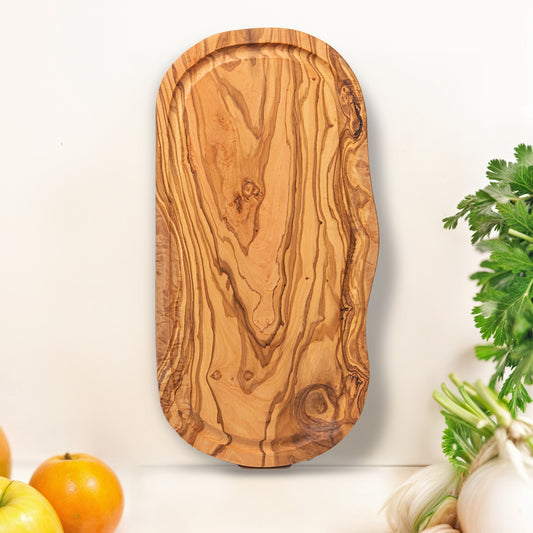 Tabla de Cortar y Servir en Madera Olivo Mediterráneo CERDEÑA, 100% artesanal, Ovalada con ranura de jugos, Reversible, Embutidos, Carne, Barbacoa, Queso, Pan (39 x 18 cm aproximado)
