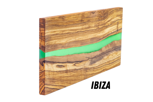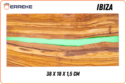 Tabla de Servir en Madera de Olivo Natural y Resina Epoxi IBIZA, Tabla Cortar Cocina 38x18x1.5 cm, Ideal para Servir Embutidos Jamon Queso Pan (Verde)
