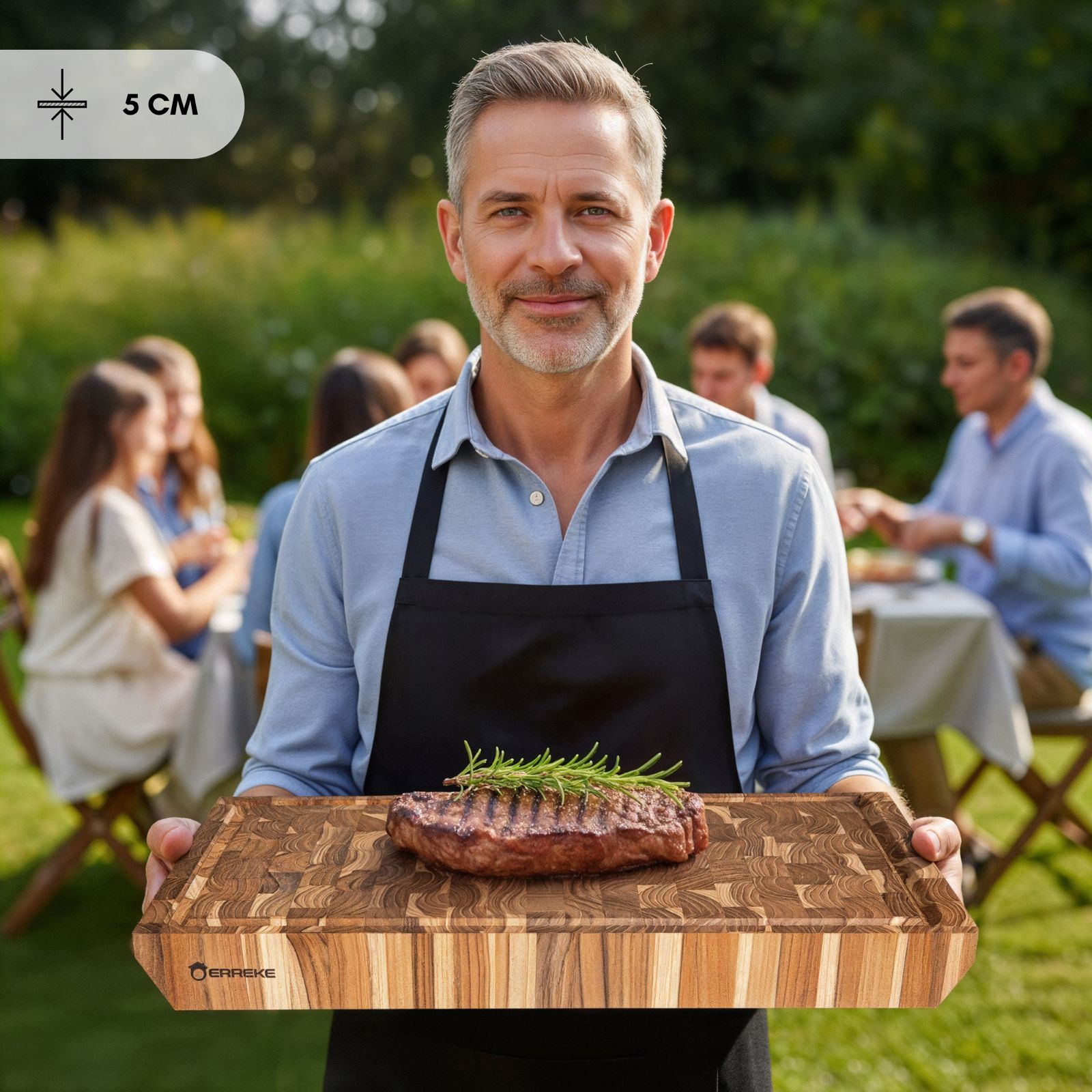 NEW ARRIVAL Tabla de Cortar 3XL en Madera Teca Natural BANGKOK, End Grain, 5 kg de Peso, 5 cm de espesor. Medidas 50x35x5.0 cm, Ranura para Jugos