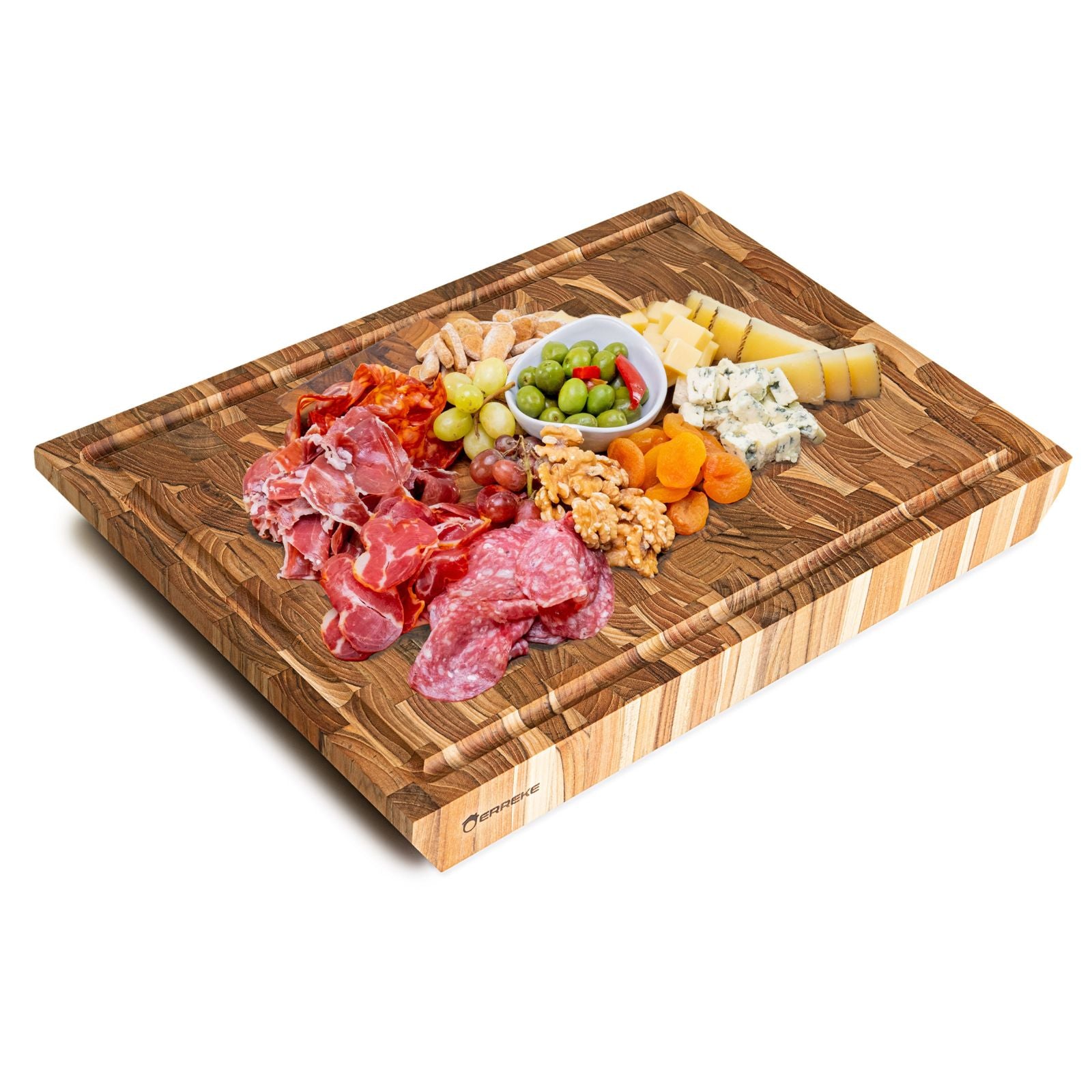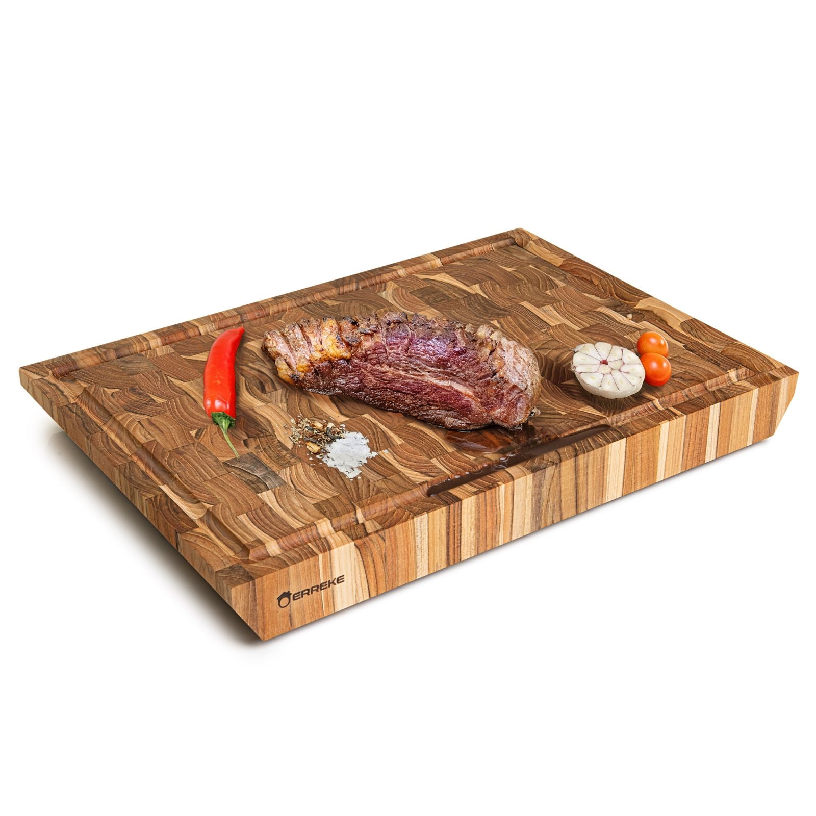 - ESPECIFICACIONES DEL PRODUCTO: Medidas del producto: 50 cm de largo, 35 cm de ancho, 5.0 cm de grosor / Material: Madera de teca brasilera / Técnica de fabricación: End Grain / Modelo incluye ranura para líquidos, asas biseladas y patas antideslizantes.