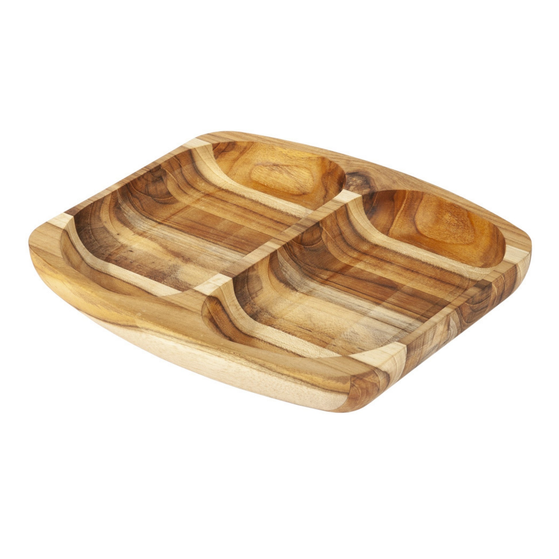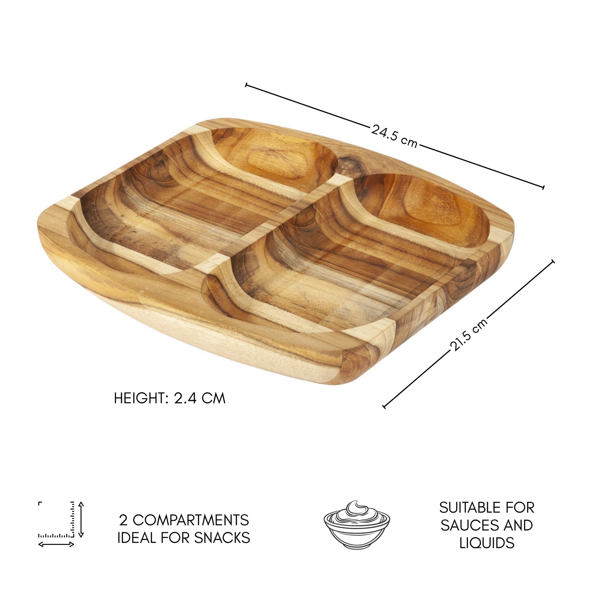 NEW ARRIVAL Bandeja para Servir en Madera de Teca Natural PALERMO, rectangular y resistente, con 2 compartimientos y cuenco para salsas, ideal para carnes, pollo, embutidos y tapas (24.5×21.5×2.4 cm)