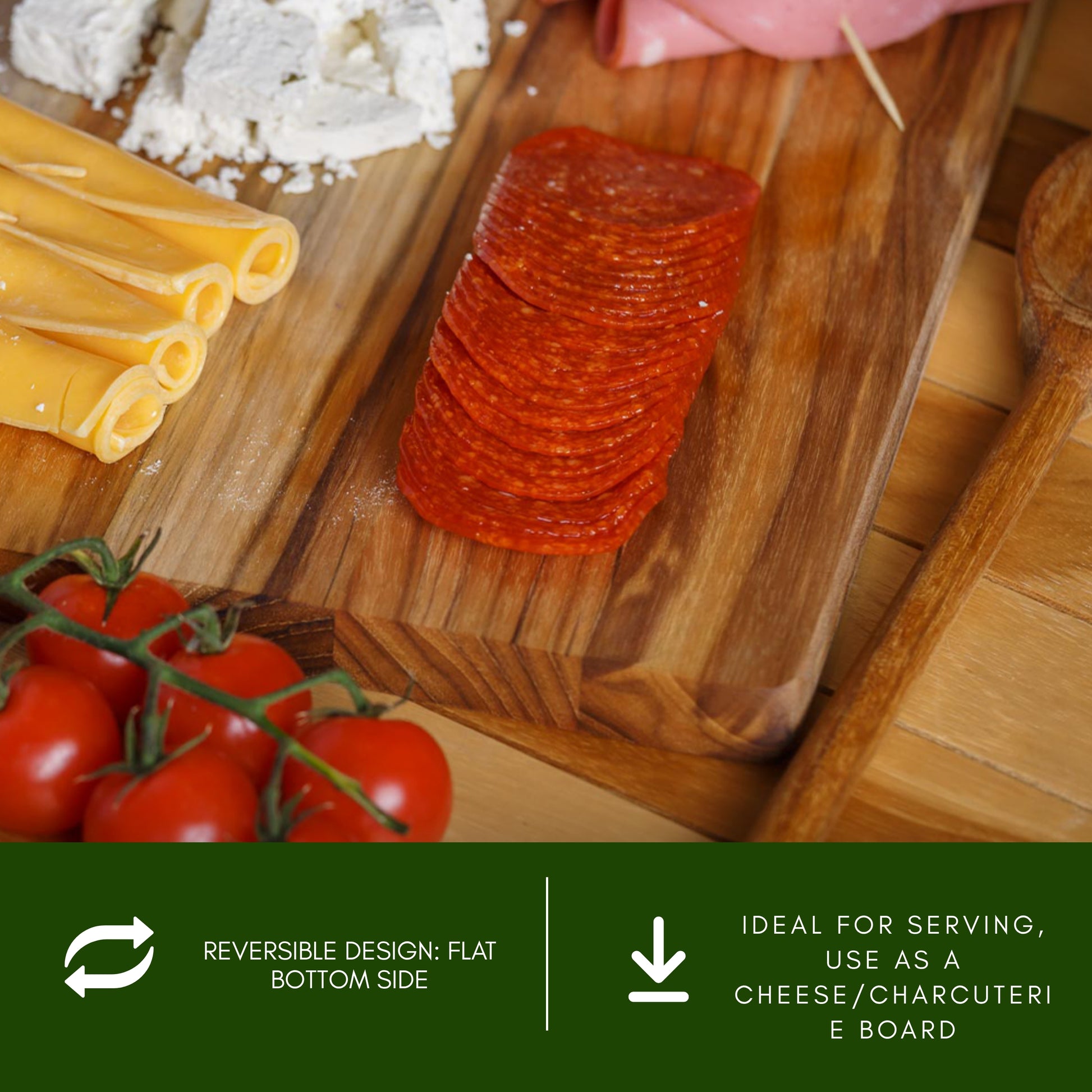 - DISEÑO REVERSIBLE 2 EN 1: Un lado con ranura para cortar alimentos jugosos, y el otro plano, ideal para servir.