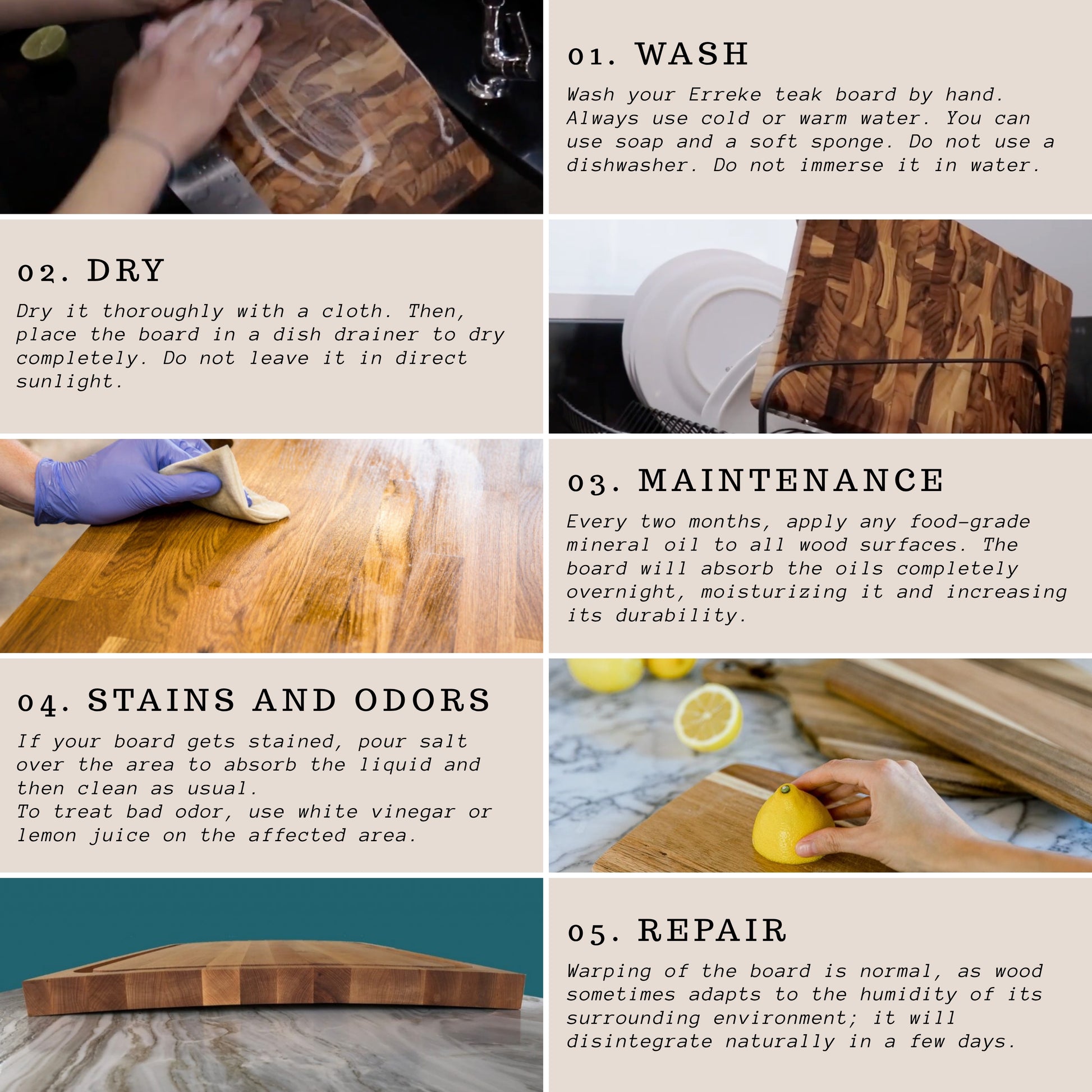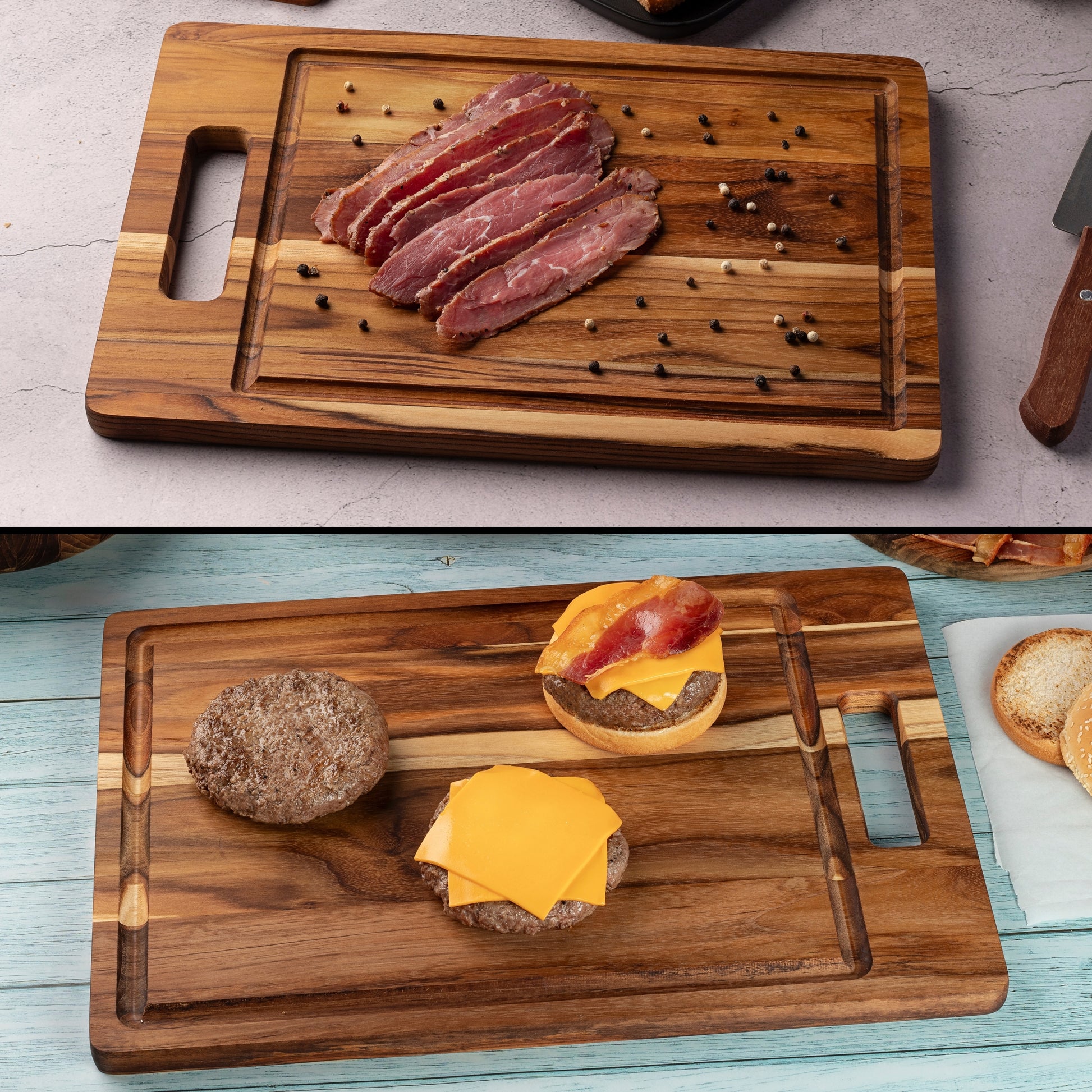- RESISTENCIA A LA HUMEDAD: Hechas con madera de teca tropical de alta calidad usualmente utilizada para hacer muebles de exterior y embarcaciones, estas tablas son naturalmente resistentes al agua, grietas, deformaciones y marcas de cuchillos.
