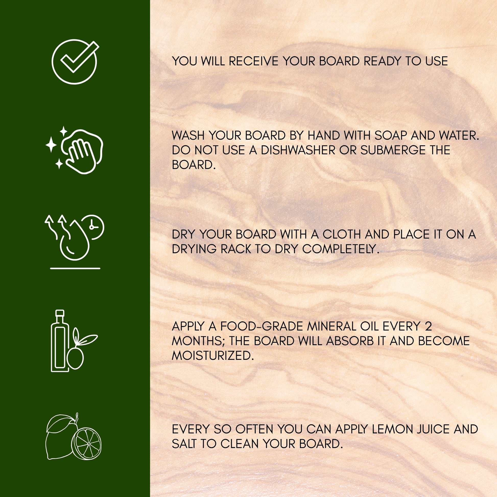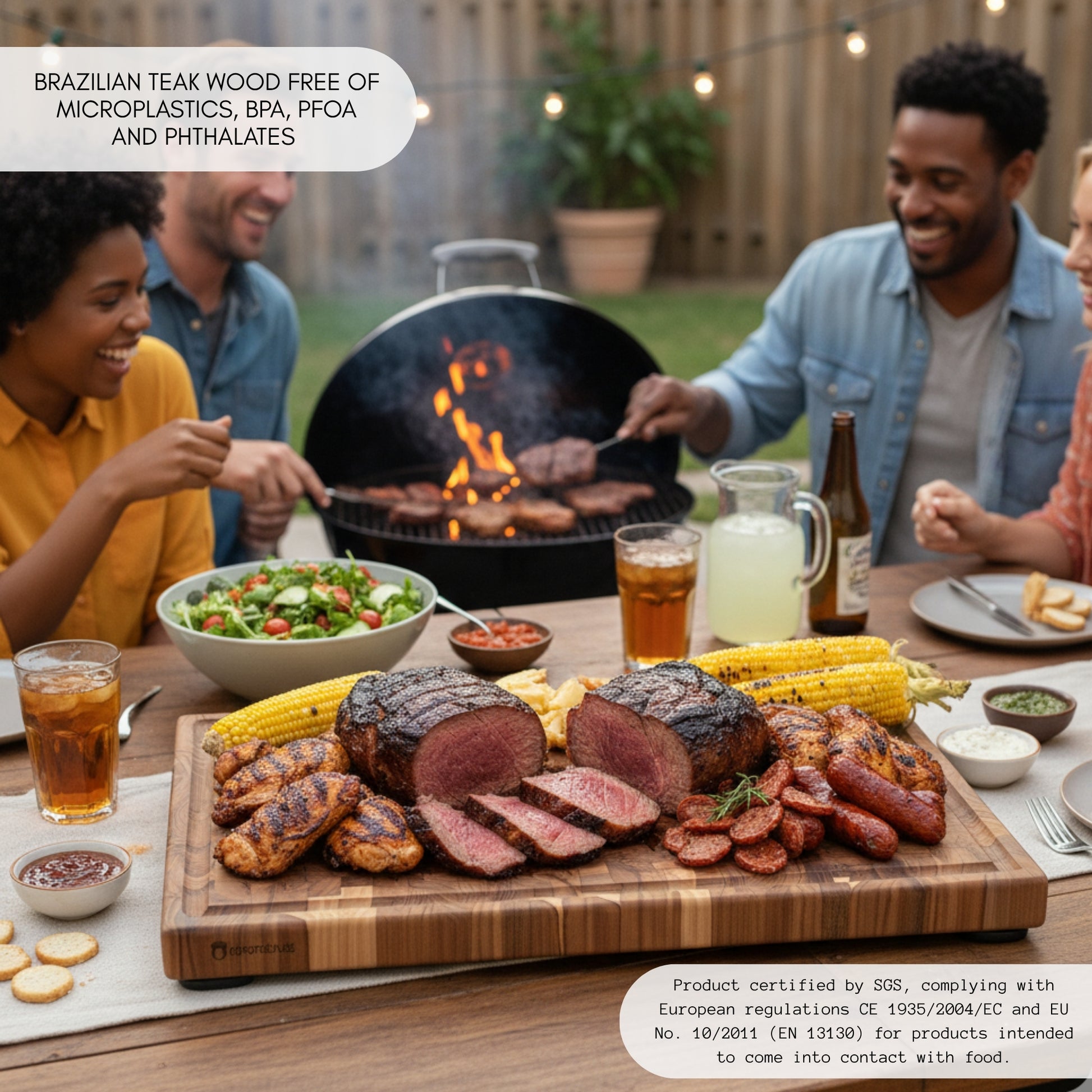 - ESPECIFICACIONES DEL PRODUCTO: Medidas del producto: 58 cm de largo, 38 cm de ancho, 3.2 cm de grosor / Material: Madera de teca brasilera / Técnica de fabricación: End Grain / Modelo incluye ranura para líquidos, asas y patas antideslizantes.