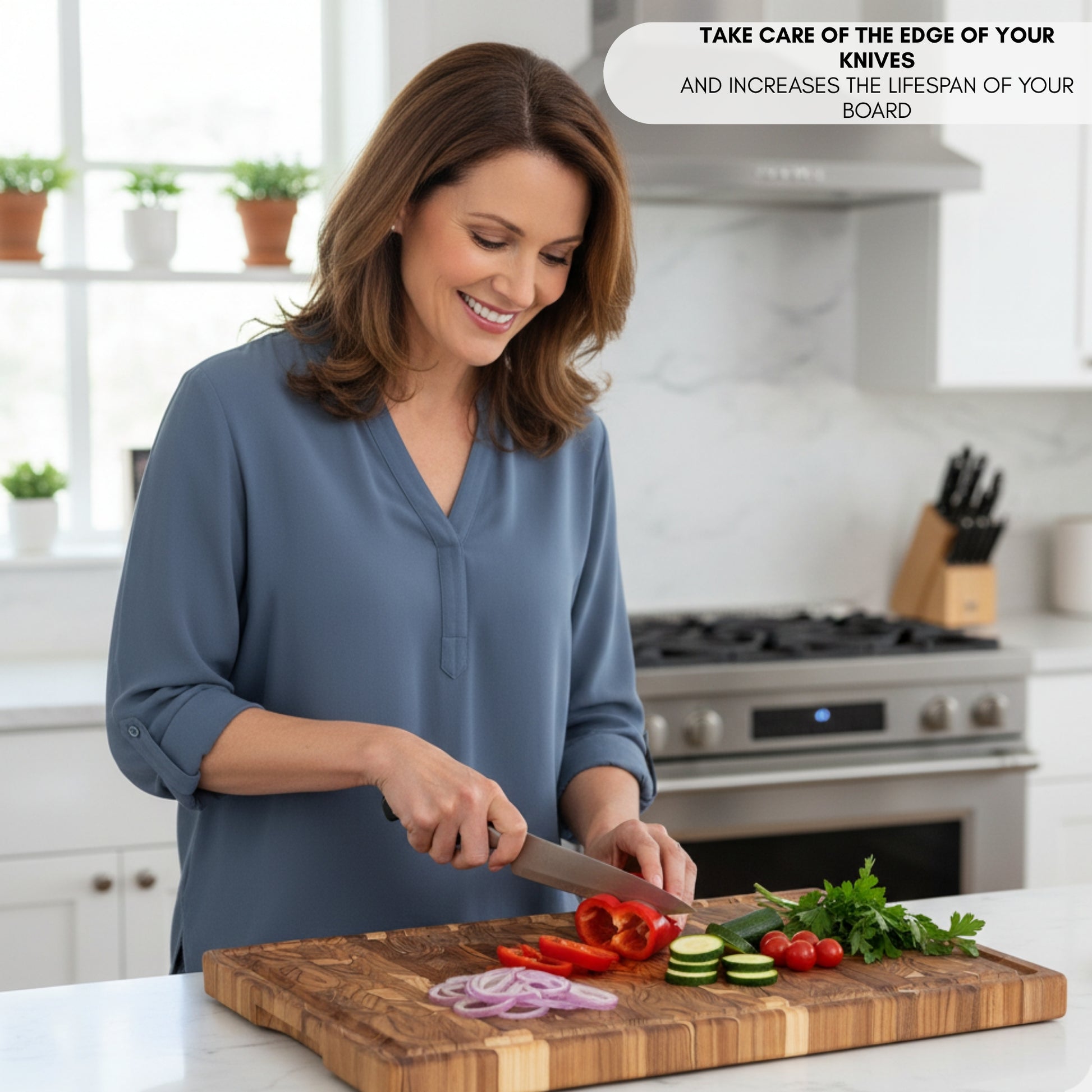 - RESISTENCIA A LA HUMEDAD: Hechas con madera de teca tropical de alta calidad usualmente utilizada para hacer muebles de exterior y embarcaciones, estas tablas son naturalmente resistentes al agua, grietas, deformaciones y marcas de cuchillos.