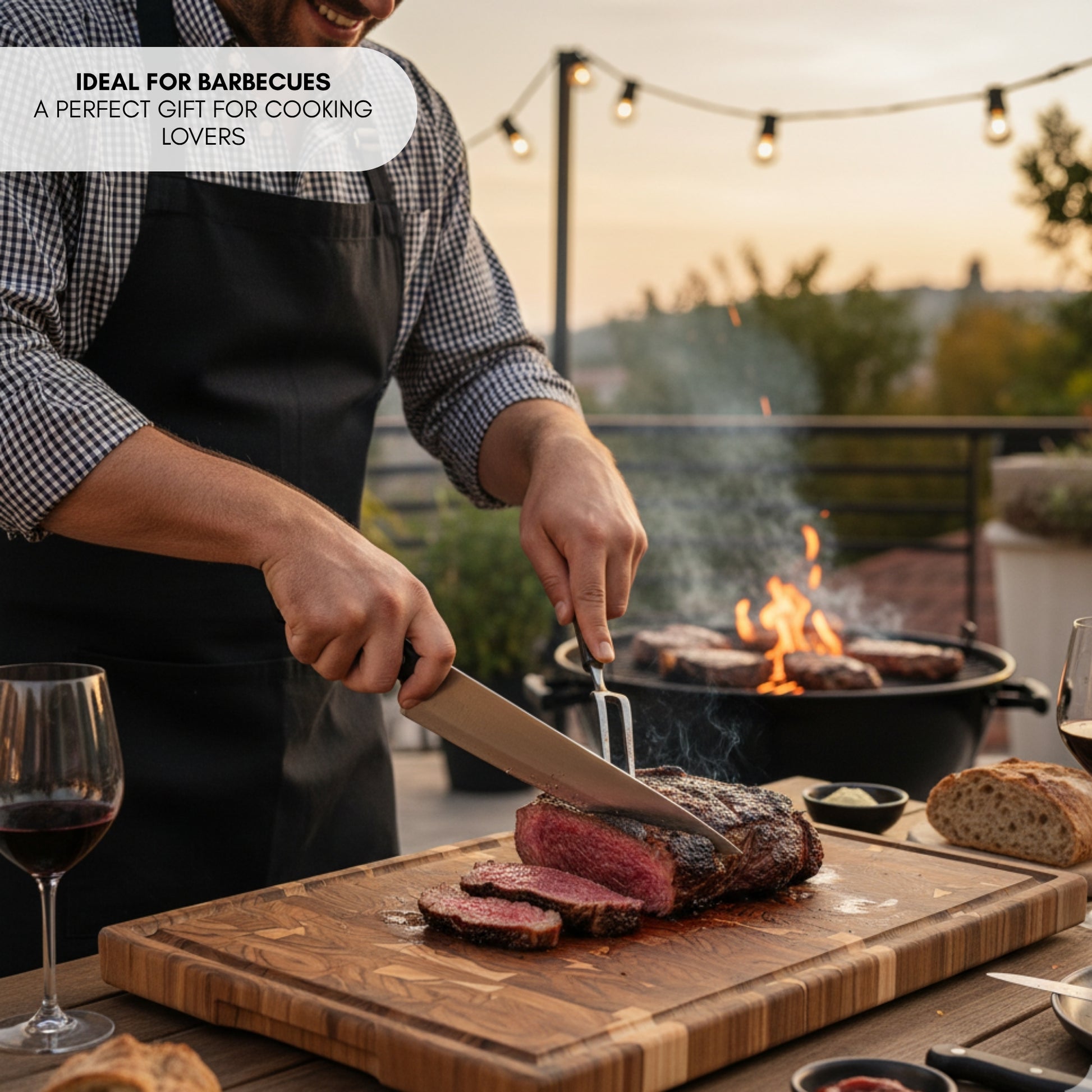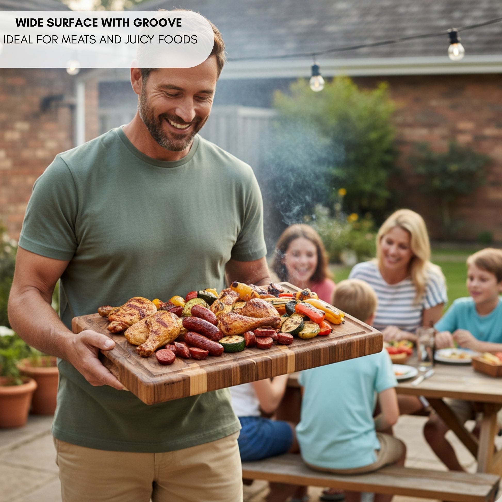 - PRÁCTICAS Y FUNCIONALES: La ranura profunda recoge los jugos y líquidos, y las asas integradas facilitan mover la tabla de la cocina a la mesa.