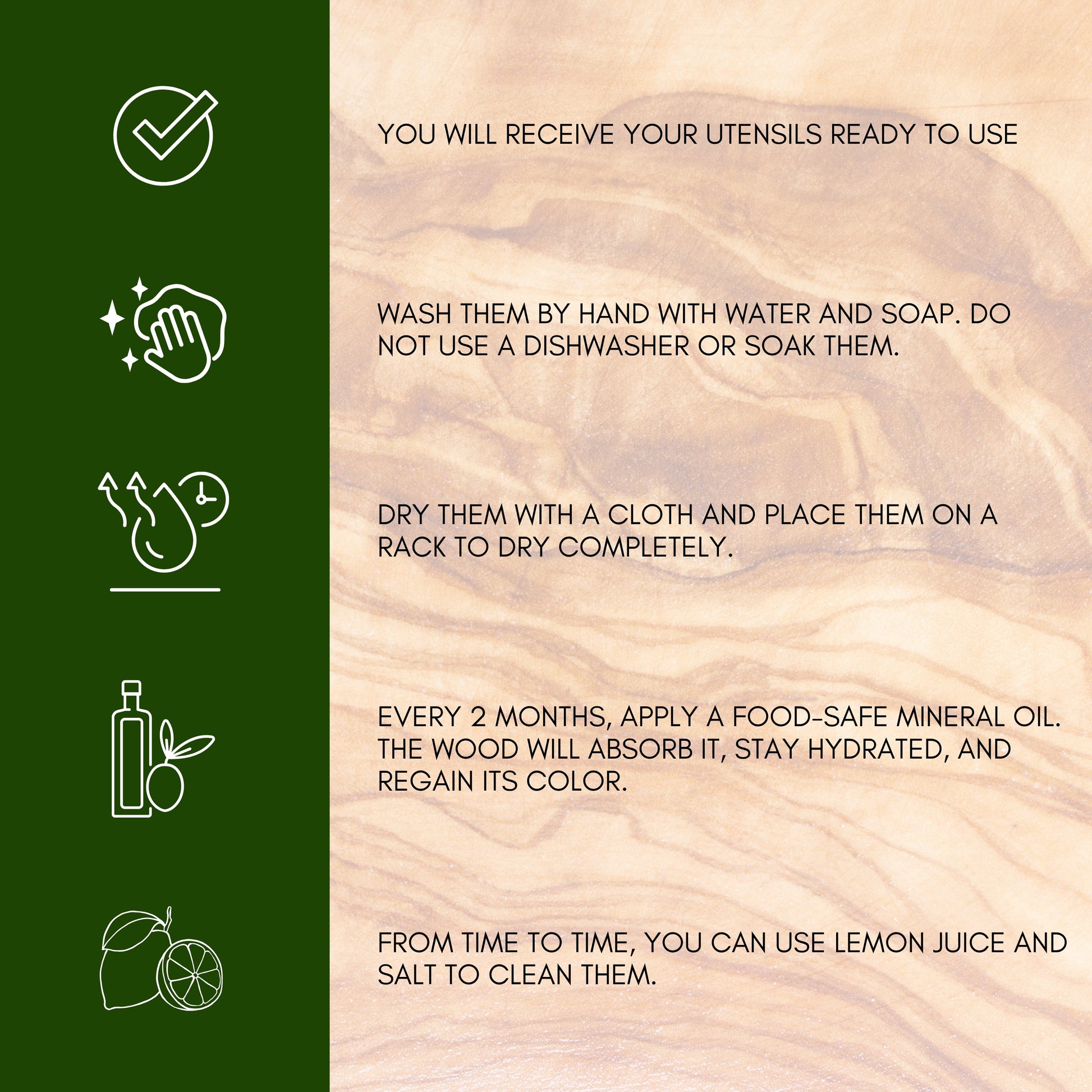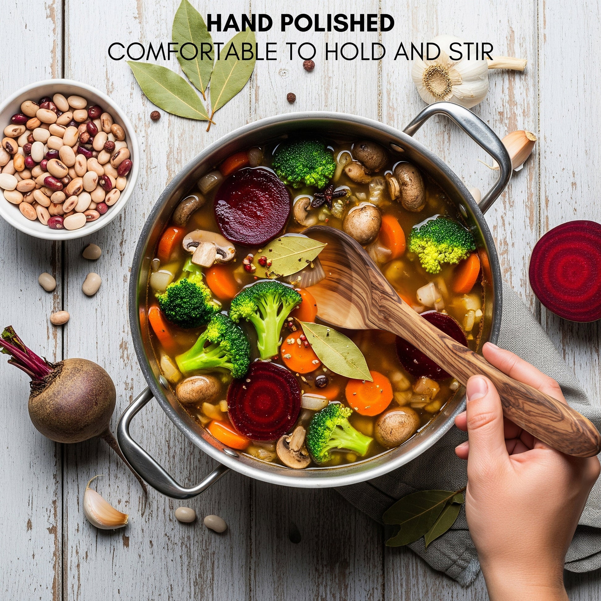 - DISEÑO ARTESANAL ÚNICO: Cada pieza está hecha a mano en madera de olivo natural, con vetas exclusivas que hacen que no haya dos utensilios iguales.